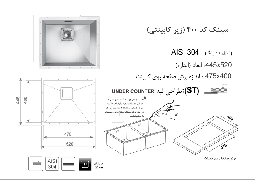 سینک ظرفشویی زیرکار اخوان مدل 400