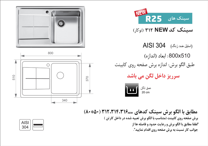 سینک ظرفشویی توکار اخوان 312