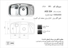 توضیحات مختصر درباره سینک اخوان توکار 141دارای استاندارد اروپا و ایراندارنده گواهینامه رعایت مصرف کنندگان در سال ۱۳۹۲برنده تندیس طلایی کیفیت از سویس و آلماندارای ۱۰ سال ضمانتدارای بست فلزی و نوار آب بندیخدمات پس از فروش گسترده در سراسر کشوربزرگترین تولید کننده سینک در خاورمیانهبرگزیده زرین کنگره ملی حماسه اقتصادی در سال ۱۳۹۲