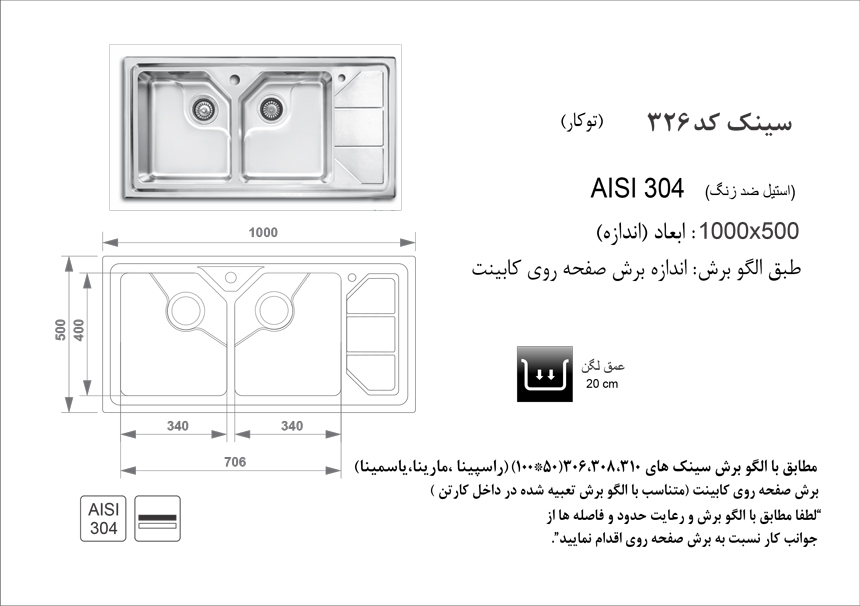 توضیحات مختصر درباره سینک اخوان توکار 326دارای استاندارد اروپا و ایراندارنده گواهینامه رعایت مصرف کنندگان در سال ۱۳۹۲برنده تندیس طلایی کیفیت از سویس و آلماندارای ۱۰ سال ضمانت ، عمق بیشتردارای بست فلزی و نوار آب بندیخدمانت پس از فروش گسترده در سراسر کشوربزرگترین تولید کننده سینک در خاورمیانهبرگزیده زرین کنگره ملی حماسه اقتصادی در سال 1392